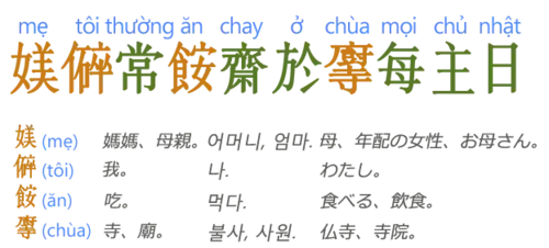 В результате сотен лет китайского владычества множество китайских слов были заимствованы во вьетнамский, включая отрицательную частицу кхонг (không, 空), которая вытеснила исконную тянг (chẳng)[2]. Чиновники использовали вэньянь, и термины, относящиеся к науке, политологии, образованию, философии и другим областям, были взяты из вэньяня. Аналогично корейцам и японцам, вьетнамцы изменили чтение китайских слов на свой манер; со временем появилась система чтения китайских иероглифов.