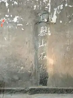 - Таблички из горного камня Тай (泰山石敢當) — самые мощные каменные таблички сделаны из камней, идущих с горы Тай. Эти каменные таблички имеют форму горы из 5 пальцев.[7] Те, на которых написано (泰山石敢當) возвращает к легенде о битве между божеством войны Чи Ю и Желтым Императором.[7] Предположительно богиня Нюва уронила табличку с надписью Чи Ю и отпугнула его. С тех пор Желтый Император повсюду размещает одну и ту же надпись, чтобы отпугнуть Чи Ю.[7]