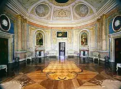 Это помещение овальной формы, с большими застеклёнными окнами-дверями. Несколько вытянутые пропорции делают его похожим на галерею — неслучайно в XVIII веке зал назывался Живописной галереей[20]. В отделке господствуют плавные линии — это скруглённые углы и пологие своды потолка, полуциркульные завершения окон-дверей.