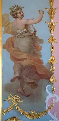 Потолок украшает плафон венецианского живописца Доменико Маджотто «Урания, обучающая юношу», паркет же, в многом перекликающийся с лепкой потолка и резным украшением алькова[11], считается одним из лучших во дворце[1][13]. Он выполнен из ореха, палисандра, самшита, лимона, берёзы и чёрного дерева[11].