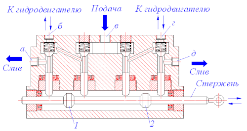 При необходимости перенаправить потоки жидкости оператор перемещает ручку управления, которая связана кинематической связью с кольцом стержня (см. рисунок). При перемещении стержня выступы 1 и 2 открывают ту или иную пару клапанов, благодаря чему осуществляется перенаправление потоков жидкости. Подача жидкости от насоса осуществляется через канал в, а слив жидкости в гидробак осуществляется по каналам либо а, либо д. Жидкость поступает к гидродвигателям или сливается от них (в зависимости от положения стержня) по каналу либо б, либо г.