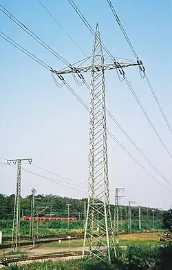 - Переменный трёхфазный ток: большинство сетей высших, средних и низких классов напряжений, магистральные, региональные и распределительные сети. Переменный электрический ток передаётся по трём проводам таким образом, что фаза переменного тока в каждом из них смещена относительно других на 120°. Каждый провод и переменный ток в нём называются «фазой». Каждая «фаза» имеет определённое напряжение относительно земли, которая выступает в роли четвёртого проводника.