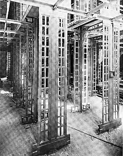 Французский архитектор Анри Лабруст впервые применил железо в Библиотеке Святой Женевьевы в 1850 году, позже он создал четырёхэтажный железный стеллаж для Национальной библиотеки Франции[4]. В 1857 году в Британской библиотеке были установлены многоуровневые стеллажи с решётчатым железным полом[3]. В 1876 году Уильям Р. Уэр разработал книгохранилище для Гоур Холла в Гарвардском университете[1]. В отличие от архитектуры большинства зданий, перекрытия этих книгохранилищ не были несущими, а, наоборот, поддерживались стеллажами. Даже нагрузка на крышу здания и на любые пространства над стеллажами (например, офисы) может передаваться на фундамент здания через стеллажную систему. Наружные стены здания действуют как оболочка, но не являются несущими[4].