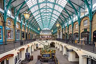 К концу 1960-х пробки стали создавать проблемы для рынка, которому требовались всё более крупные грузовики для доставки и продажи. Была запланирована реконструкция, однако протесты со стороны Ассоциация Общества Ковент-Гарден в 1973 году вынудили присвоить десятку зданий вокруг площади статус культурной ценность, что предотвратило реконструкцию[58]. В следующем году рынок переехал на новое место в «Новый Рынок Ковент-Гарден», примерно в 5 км на юго-восток в районе Найн Элмс. Центральное здание вновь открылось в 1980 году в качестве торгового центра и теперь является туристической достопримечательностью с кафе пабами, маленькими магазинчиками и ремесленным рынком под названием «Яблочный Рынок»[59]. Другой рынок, Юбилейный, находится в Юбилейном Холле на южной стороне площади[60].