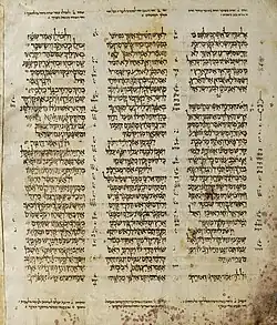 Ко́декс Але́ппо (ивр. כֶּתֶר אֲרָם צוֹבָא, Кетер Арам–Цова[2]) — рукопись Танаха, написанная в начале X века н. э.[3] в Тверии писцом Шломо Бен Буйией. Кодекс давно считается самым авторитетным документом Еврейских Писаний, которые передавались из поколения в поколение[4]. Сохранившиеся в литературе примеры респонса показывают, что различные еврейские учёные на протяжении всего Средневековья использовали Кодекс Алеппо, а современные исследования показали, что данный труд является одним из самых точных принципов масоры (מָסוֹרָה — «предание») из любой из сохранившихся рукописей и содержит очень малое количество ошибок (среди примерно 2 700 000 орфографических деталей). По этим причинам многие учёные считают Кодекс Алеппо самым авторитетным представителем масорской традиции как по огласовкам, так и по знакам кантилляции, несмотря на то, что большинство текста в настоящее время отсутствует.