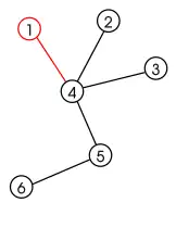 Для дерева на диаграмме вершина 1 является концевой вершиной с наименьшим номером, поэтому она удаляется первой, и 4 записывается в код Прюфера.