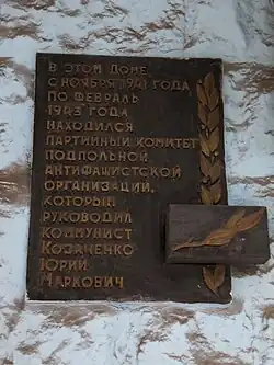 - ↑ Вказівна дошка на честь керівника підпільної групи Козаченка Ю. М. Архивная копия от 20 июля 2019 на Wayback Machine (укр.)