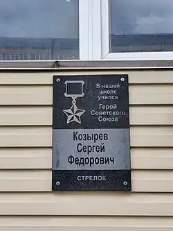 Мемориальный бюст героя советского союза Козырева Сергея Федоровича, расположен у школы №3 города Выкса - Памятная доска на школе №3 города Выкса
