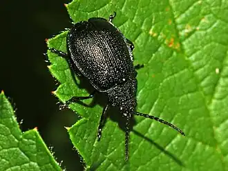 Жук длиной от 6 до 11 мм. Тело чёрное, овальное, выпуклое. Личинки тёмные, покрыты щетинками на мясистых выростах.[3]