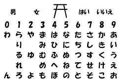 Листы вызова имеют слова: «Да» (хай) はい или «Абсолютно» (дзэн) 然、 «Нет» (ийе) いいえ или 否 (ия) — справа; «Женщина» (онна) 女и «Мужчина» (отоко) 男 — слева от ворот тории (мужчина и женщина могут отсутствовать, если их нет, то «да» и «нет» пишут по бокам тории).