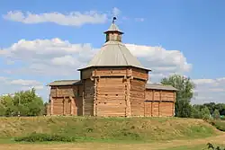 Церковь Георгия Победоносца c колокольней и трапезной | 1600—1648 | Колокольня современной церкви была построена в начале XVI века и принадлежала рядом расположенному храму Вознесения. Исследователи предполагают, что в конце XVII века колокольню перестроили в церковь. В 1840—1842 годах деревянная часть была разобрана, а на месте старой трапезной была возведена современная церковь Святого Георгия Победоносца[23]. |