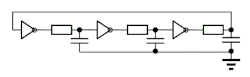 Простейший генератор (Фиг. 2) может быть построен соединением в кольцо трёх инверторов. Подобная схема стартует сразу после подачи питания и генерирует сигнал с частотой 1/6Td, где Td — задержка распространения сигнала через одиночный инвертор. В «чистом» виде подобный генератор обладает сильной зависимостью частоты от питающего напряжения и температуры, а также от свойств транзисторов из которых построены цифровые инверторы. Это свойство, однако, применяется в интегральных микросхемах для контроля параметров процесса. Небольшой тестовый блок состоящий из типичных (библиотечных) элементов, как инвертора, И-НЕ, ИЛИ-НЕ элементов объединенных в кольцевые генераторы, генерирует набор сигналов, измерение частоты которых даёт информацию о задержках каждого из элементов для данного процесса, напряжения питания и температуры.