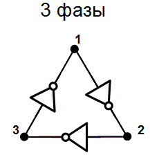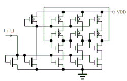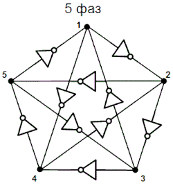 Ограничение тока через инвертор с помощью пары токовых зеркал (Фиг. 3) позволяет управлять задержкой распространения сигнала, и соответственно частотой кольцевого генератора. В таком виде кольцевой генератор может быть использован в качестве элемента ФАПЧ (PLL). Каждый из составляющих кольцевой генератор инверторов может быть дополнен RC-цепочкой. В этом случае (Фиг. 4) задержка на элемент будет в меньшей степени определяться самим инвертером, и в большей степени задержкой RC-цепи. Это позволяет получить генератор с частотой гораздо в меньшей степени зависящей от параметров транзисторов, напряжения питания и температуры. Простейший 3х-элементный кольцевой генератор (Фиг. 2) имеет на выходе 3 сигнала сдвинутых по фазе на 120 градусов. Используя 5, 7 и более каскадов можно получить произвольное количество фаз, однако стоит избегать числа каскадов не равного простому числу, например 9 или 15. Проблема состоит в том, что в генераторе состоящем из, например 9и элементов могут возникать как колебания с частотой 1/18Td, так и колебания с частотой 1/6Td. То есть по кольцу будут распространяться группы сигналов в виде трёх логических единиц, и трёх «нулей». Часто возникающая задача получения тактовых импульсов со сдвигом в 90 и 180 градусов может быть решена объединением трёхэлементных кольцевых генераторов в более сложную структуру (Фиг. 5). Такая схема генерирует две пары комплементарных сигналов сдвинутых на 90 градусов. Существуют структуры, состоящие из инверторов, для генерации восьми и более фаз. Иногда требуется получение нечётного количества фаз, но простая схема из, к примеру, 5и инверторов имеет суммарную задержку не позволяющую получить сигнал требуемой частоты. В этом случае возможно построение пяти-фазного кольцевого генератора из нескольких трёхэлементных (Фиг. 6).