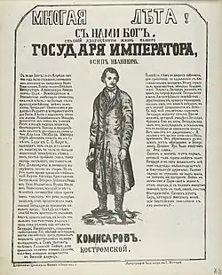 - Поступок крестьянина Осипа Комисарова сравнивался с подвигом Ивана Сусанина, тем более что его родное село Молвитино находилось всего в 12 верстах от села Домнино — родины Сусанина[8]; в театрах играли оперу «Жизнь за царя», течение которой многократно прерывалось общим пением «Боже, царя храни»[8]. Московский историк и общественный деятель М. П. Погодин предлагал на собранные со всей России деньги купить Комиссарову имение и назвать его «Домнино второе»[9].