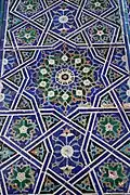 Внутри портальной ниши, над южным входом в мечеть (южная худжра) под поясом сталактитов, в большом мозаичном панно вплетена историческая, посвятительная надпись. Буквы жёлтые, почерк насх — верхняя строка и сульс — нижняя строка.