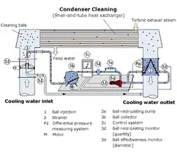 В процессе работы поверхность трубок конденсатора, в которые поступает вода из водоёмов (рек, прудов, озёр и т. д.), загрязняется биологическими и минеральными отложениями, что ухудшает экономичность работы турбин. Во избежание обрастания водяного тракта биологическими организмами охлаждающую воду обычно хлорируют. В замкнутых системах охлаждения целесообразно проводить «продувку», то есть добавление свежей воды. Фильтрация охлаждающей воды, как правило, неэкономична из-за огромного расхода воды. Большинство современных конструкций конденсаторов позволяет производить механическую очистку части трубок без перерыва работы с отключением некоторых пучков. Широко применяются также системы очистки конденсаторов эластичными шариками из пористой резины, которые прогоняются по трубкам напором воды.