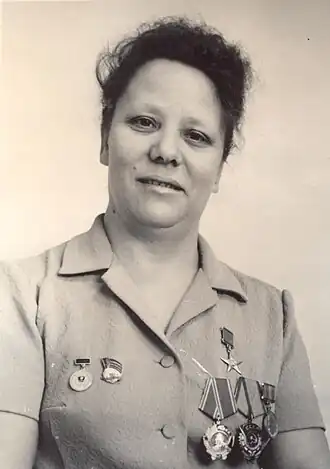 Указом Президиума Верховного Совета СССР от 16 января 1974 года за выдающиеся успехи в выполнении и перевыполнении планов 1973 года и принятых социалистических обязательств удостоена звания Героя Социалистического Труда с вручением ордена Ленина и золотой медали «Серп и Молот».