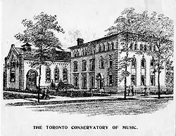 Торонтская музыкальная консерватория была основана в 1886 году канадским дирижером Эдвардом Фишером, остававшимся её директором до 1913 года. Первых студентов консерватория приняла в 1887 году, став первым высшим музыкальным учебным заведением Канады. Среди преподаваемых предметов, помимо собственно игры на музыкальных инструментах (включая саксофон, гитару и цитру), были теория музыки, иностранные языки, красноречие, преподавание музыки в школах, акустика, настройка музыкальных инструментов, а также вокальная анатомия и гигиена. С 1888 по 1904 год консерватория находилась под патронажем колледжа Тринити, а с 1896 года под покровительством Торонтского университета, что позволяло её выпускникам получать университетский диплом. После окончания учебы по основной специальности студент получал степень Associate, после окончания двух курсов обучения — Fellow (с 1914 года Licenciate). Первый выпускник по классу фортепиано вышел из стен консерватории в 1889 году. В том же году консерватория получила свой органный зал в соседнем комплексе YMCA.