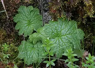 Базальные (первичные) листья с длинными, 6—13 см, черешками, в общем очертании округло-почковидные, неглубоко (до 1⁄4 поперечника) надрезанные на 7—13(15) полукруглых тупозубчатых лопастей с зубцами разной величины. Пластинка листа довольно крупная, округлая. Размеры листьев на одном взрослом растении варьируют от 3 до 9 см. Основание листа сердцевидное. Опушение из беловатых (рыжеватых[13][14]) волосков. Сильнее опушены основание стебля и черешки листьев, нижняя сторона листа имеет опушение в основном по жилкам, верхняя сторона почти голая. У проростков, как правило, не более одного — двух листьев, часто с сохранившимися семядолями; при этом листовая пластинка округло-сердцевидная, без лопастей и зубцов. Ювенильные особи также несут один или два, реже три листа, но уже с развитым опушением. Листовые пластинки ювенильных растений — с хорошо различимыми лопастями; иногда на них заметны зубцы первого порядка. У имматурных (переходная форма в период усиленного образования вегетативных органов) особей от двух до четырёх листьев, а листовая пластинка в очертании очень схожа с листовой пластинкой взрослого растения, зубчато-лопастная. У генеративных особей листья могут быть более мелкими, чем у вегетативных[12]:195.