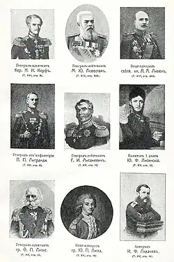 - ↑ Милорадович Г. А. Корф барон Николай Иванович // Царствование императора Александра II-го. Генералы, состоящие при Особе Его Величества // Список лиц свиты их величеств с царствования императора Петра I по 1886 г. По старшинству дня назначения. Генерал-адъютанты, свиты генерал-майоры, флигель-адъютанты, состоящие при особах, и бригад-майоры. — Киев: Типография С.В. Кульженко, 1886. — С. 165.