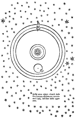 Таким образом, нет сфер с вогнутой и выпуклой поверхностью, нет деферирующих кругов, но все есть одно поле, общее небесное вместилище… То, следовательно, что заставляло воображать различные небеса, было движением различных звёзд: видели небо, наполненное звёздами, которое вращается вокруг Земли, причём ни одно из этих светил не отдалялось одно от другого, но все они всегда сохраняли между собой одно и то же расстояние и отношение и один и тот же порядок; все они вращались вокруг Земли, подобно тому как вращается вокруг своей собственной оси колесо, на котором прикреплены бесчисленные зеркала. Считали очевидным, как это кажется нашим глазам, что эти светящиеся тела не обладали своим собственным движением, благодаря которому они могли бы сами двигаться подобно птицам по воздуху; полагали, что они движутся, прикреплённые к своим орбитам, которые получали своё движение от толчка некоей божественной интеллигенции… И нет иных внешних двигателей, которые с помощью фантастических движений сфер переносили бы эти тела как пригвождённые к ним[44].