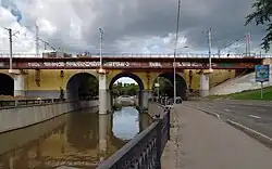 | Вид на Костомаровскую набережную и эстакаду Костомаровского моста (2008). Здание (Костомаровский переулок, 15) было снесено в 2008 году | |