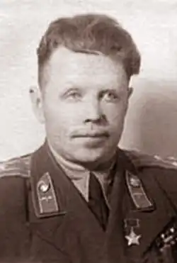 - ↑ На момент присвоения звания Героя Советского Союза — батальонный комиссар.