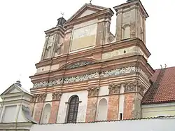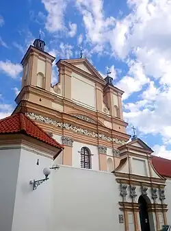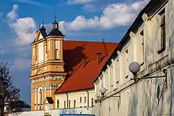Костёл — памятник архитектуры раннего барокко. размещён в центральной части комплекса. Смещение всего монастырского комплекса к северо-западному углу участка обусловлено оборонительными мотивами (таким образом осуществлялся контроль важного уличного перекрёстка на подступах к центру), также учитывался ансамбль застройки улицы. В плане комплекса костёл органично соединён с монастырём и создаёт с ним единое целое[24].
