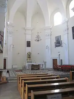 Постройка имеет однонефную структуру с полукруглым алтарным завершением, встроенным в общий прямоугольный план. Внутри неф перекрыт цилиндрическим сводом очень значительного пролёта с распалубками без подпружных арок. Единственная подпружная арка на сильно выступающих пилонах отделяет алтарную часть перекрытую конховым сводом с четырьмя радиальными распалубками). Во входной части (согласно кроку капитальной стены монастыря) выделен нижний неконструктивный нартекс[25].