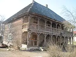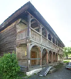 Во дворе монастыря сохранилась уникальная деревянная двухэтажная постройка XVII века хозяйственного назначения — лямус. Лямус представляет собой двухэтажную прямоугольную в плане постройку с высокой вальмовой крышей (возможно, первоначально крыша была черепичной). Лямус построен в 1630-е гг.[31] из массивного бруса без единого гвоздя, на бутовом фундаменте. Все конструктивные элементы связаны подсечками и деревянными клиньями. Главный северный фасад оформлен двухъярусной арочной галереей (подсенями) с балюстрадой на втором этаже. Нижняя плоскость подкосов и балок над ними создают сплошные полукруглые проёмы. Лямус использовался под жильё и хозяйственные нужды: первый этаж был складским помещением, второй был жилым. Позже планировка была изменена[28].