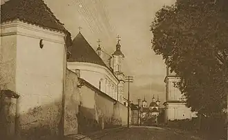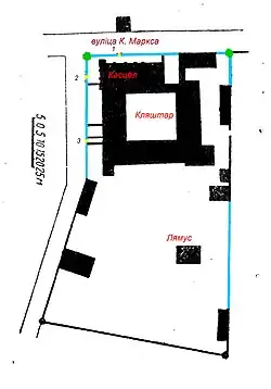 Весь монастырь был обнесён просторными каменными стенами, внутри был разбит сад. В 1950-е годы была разобрана вся ограда с южной стороны вместе с двумя внешними башнями, брама и часть восточной стены[33].