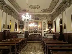 Внутри костёл покрыт плоским оштукатуренным потолком, фресковой росписью — архитектурный карниз с ангелами (верхняя часть стен), кессоны с розетками и медальоны с изображениями евангелистов на потолке. Стены молитвенного зала расписаны архитектурными росписями в стиле классицизма (пилястры, карнизы, фризы) и технике гризайль. В метопах фриза находится несколько десятков одинаковых изображений ангелочков, у каждого из которых в руках определенный сакральный предмет или музыкальный инструмент: монстранция, чаша, плащаница, митра, труба, барабан и т. д.