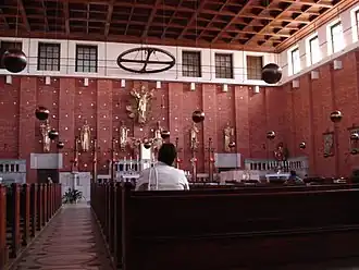 Интерьер храма функционален, но при этом изыскан и торжественен. Плоскость стен подчеркнута пилястрами. Вдоль стен располагаются деревянные статуи чешских святых, а посередине алтарной стены возвышается монументальная статуя Христа, творение Д.Песана.