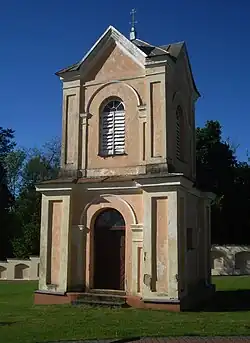 Костёльный двор опоясан каменной оградой, за которой располагается деревянная колокольня (построенная в 1881 — 1884 годах местным мастером Игнацием Здановичем), постройки бывшего монастыря и деревянная статуя на колонне перед храмом, напротив входа. Статуя изображает святую Агату, которая, по преданию, хранит от молний и пожаров, так как в 1808 году молния ударила в купол и сгорела крыша.