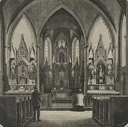 Интерьер постройки имеет симметричную композицию. Центральный неф и апсида перекрыты цилиндрическими сводами с распалубкой. В нартексе — крестовый свод. Внутренняя поверхность стен декорирована пилястрами и карнизами. Окна декорированы орнаментальными витражами[4].