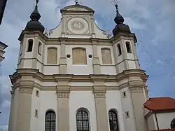 Главный барочный фасад членится двумя широкими полосами карнизов на три яруса. Пилястры между окнами первого яруса украшает орнамент из стилизованных веточек руты (вместо обычного аканта). Во втором ярусе окна лишь в башнях; простенки заполнены тремя неглубокими нишами, в которых прежде были фрески. В сравнительно небольшом фронтоне фасада располагается круг с эмблемой и годом окончания строительства «1625» над ним.
