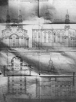 Костёл иезуитов, обращённый ныне в православный храм, чрезвычайно красив. Он построен ещё во время князей Вишневецких. Если смотреть на Пинск из-за реки Пины, то этот храм и дом Скирмунта как бы царят над деревянным городом. Внутри собора мы не могли найти ничего замечательного, кроме двух незабелённых фресок, всё остальное забелено[2].