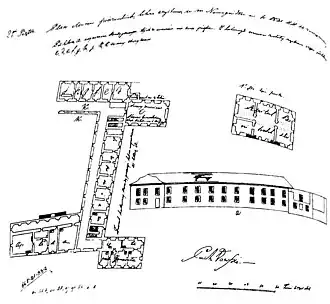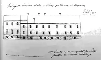 Иезуитский коллегиум в Новогрудке, изображение здания с противоположной стороны, эта часть фасада находилась на краю холма.