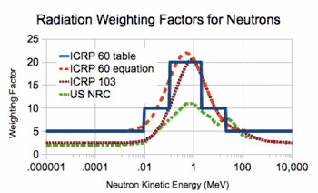 | Нейтроны от 100 кэВ до 2 МэВ | 20 | 2,5 + 18,2·e-[ln(E)]²/6 (до 1 МэВ) 5,0 + 17,0·e-[ln(2·E)]²/6 (от 1 МэВ) |