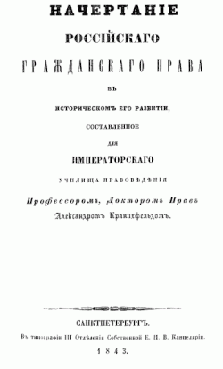 - Начертание российского гражданского права в историческом его развитии, составленное для Императорского Училища правоведения профессором, доктором прав Александром Кранихфельдом. — Санкт-Петербург: тип. III Отд-ния Собств. е. и. в. канцелярии, 1843. —XII, 327, [15] с.