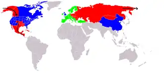 Синий: Соединённые Штаты Америки и их союзники: Канада, Великобритания и Китайская Народная Республика.