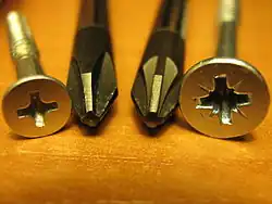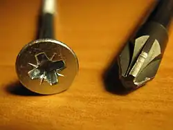 Слева — крепёж со шлицем Филлипс и отвёртка Филлипс (PH 2) с трапециевидной гранью зуба,