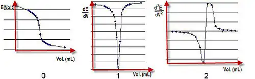 - первую производную от функции кривой — абсцисса пикового значения будет соответствовать объёму добавленного титранта;
