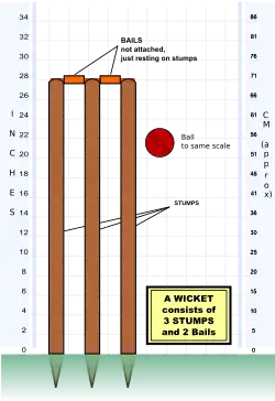 Правило 8: Калитки. Калитка (англ. wicket) состоит из трёх деревянных столбцов высотой 28 дюймов (71 сантиметр). Столбцы располагаются вдоль узкого края питча на одинаковом расстояния друг от друга. Ширина калитки составляет 9 дюймов (22,86 сантиметров). На столбцах расположены две незакреплённые деревянные перемычки, называемые бейлами (англ. bails). В некоторых случаях, например, при наличии ветра, судьи могут принять решение об игре без бейлов[прим. 5][16].