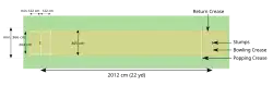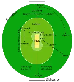 Схема поля для игры в крикет. Жёлтым цветом обозначен питч, зоны в радиусе 15 ярдов (13,7 м) от бэтсмена выделены фисташковым цветом. Внутренняя часть поля, выделенная светло-зелёным, находится внутри белого круга (эллипса) радиусом 30 ярдов (27,4 м). Внешняя часть поля обозначена тёмно-зелёным цветом, её диаметр варьируется в интервале от 450 до 500 футов (137—150 м).