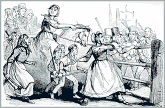 В 1839—1840 годах по западному и среднему Уэльсу прокатились бунты Ребекки[12], организованные фермерами и батраками против несправедливого налогообложения, в ходе которых восставшие часто одевались женщинами по образу библейской Ревекки[13].