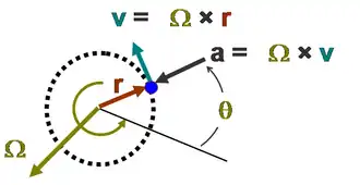 и есть вектор, перпендикулярный как Ω так и r ( t ), направленный по касательной к орбите и имеющий величину ω R. Аналогично, ускорение определяется как: