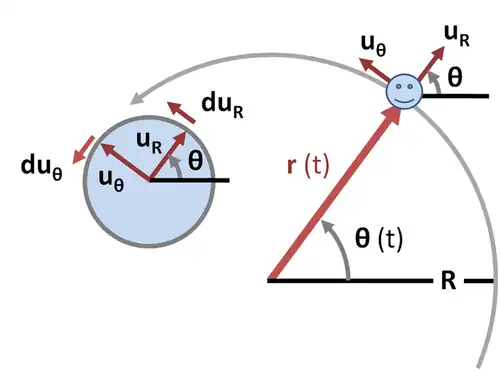 Поскольку радиус окружности является константой, радиальная составляющая скорости равна нулю. Единичный вектор имеет инвариантное по времени значение, так что при изменении времени его конец всегда лежит на окружности единичного радиуса, а угол θ такой же, как у . Если произошло малое приращение угла dθ за время dt, тогда описывает дугу единичной окружности со значением dθ (см. единичную окружность слева на рис. 2). Следовательно: