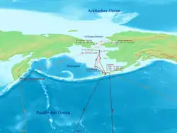 - 3 июля 1816 года «Рюрик» отправился в Берингово море. На берегу были оставлены Вормскильд (по причине конфликта) и лейтенант Иван Захарьин (по причине болезни); на корабле, таким образом осталось всего два офицера: Коцебу и лейтенант Глеб Семёнович Шишмарёв. Определив координаты северной оконечности острова Беринга, Коцебу прошёл к острову Св. Лаврентия и высадился на его южном берегу; 18 июля «Рюрик» был в Беринговом проливе. Здесь Коцебу стал жертвой ошибки, посчитав остров Ратманова за третий в группе островов Диомида; тогда как эти острова состоят только из двух островов: Ратманова и Крузенштерна и скалы Фэруэй. Следуя вдоль побережья Аляски «Рюрик» прошёл мимо бухты Шишмарёва и острова Сарычева и 20 июля подошёл к большому заливу, который первоначально Коцебу ошибочно посчитал проходом в Северный Ледовитый океан. Описав этот залив, названный позже заливом Коцебу с бухтой Эшшольца и островом Шамиссо, Коцебу на запад, — к мысу Дежнёва и, описав берег залива Лаврентия с двумя небольшими островами Хромченко и Петрова, названных так в честь штурманов «Рюрика»[1], Коцебу 17 августа повернул на юг и 26 августа был в бухте Иллюлюк острова Уналашка.