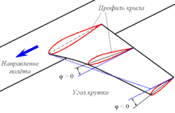 - геометрическая крутка: крыло имеет одинаковый профиль по всему размаху, но установочные углы профилей меняются таким образом, что профили в концевой части крыла обтекаются под меньшим углом атаки, чем в корневой части.